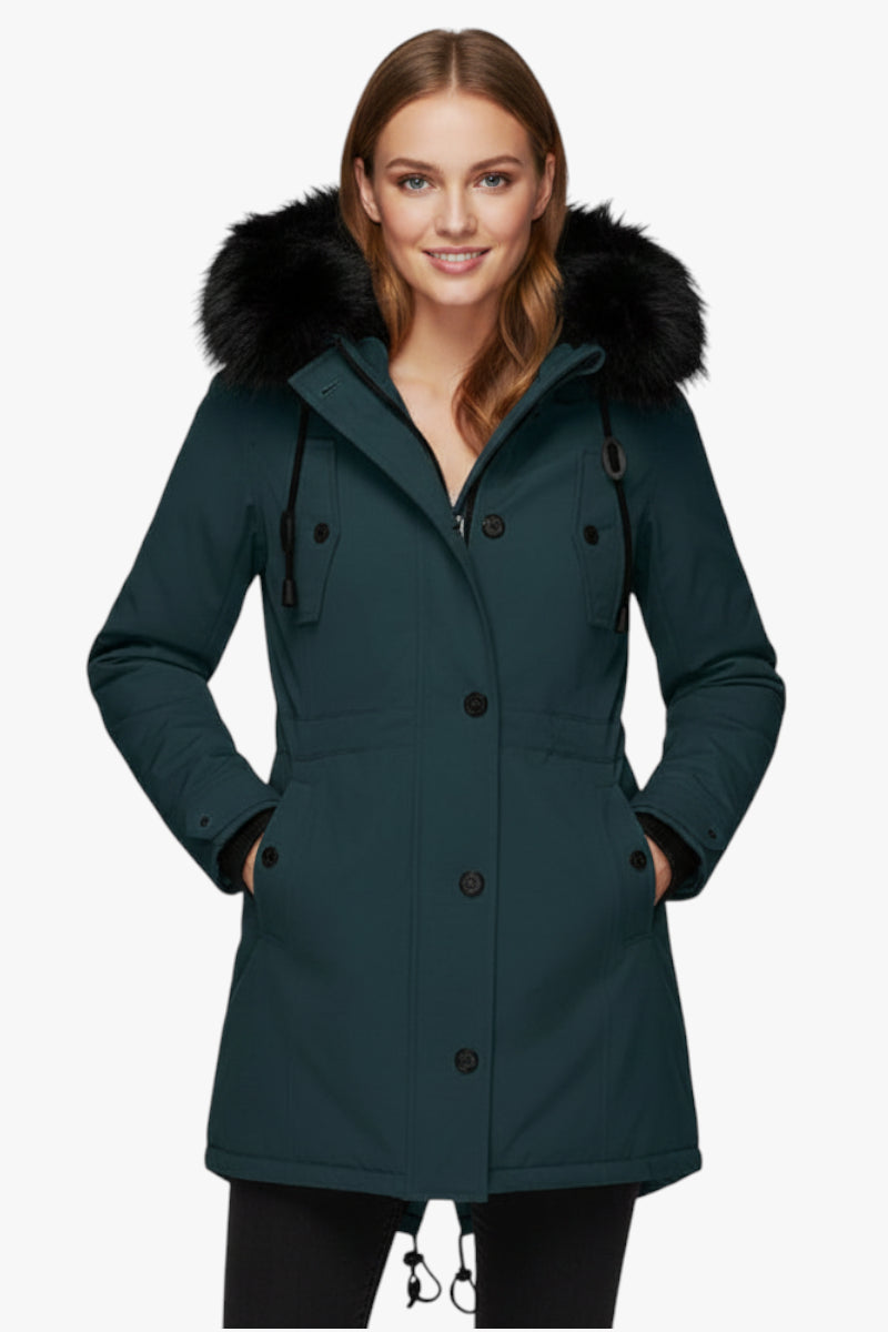 Dieser Parka kombiniert kernige Isolation mit einer schmeichelnden Silhouette. Die üppige Kunstfellkapuze, der längere Schnitt und die verstellbare Taille sorgen für Schutz, Komfort und einen stilvollen Auftritt – ob in der Stadt oder auf Winterspaziergängen.